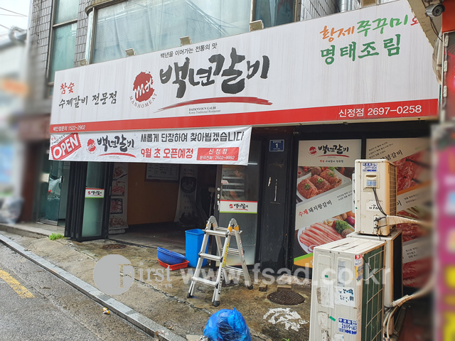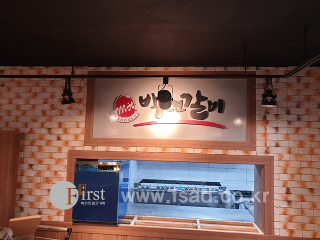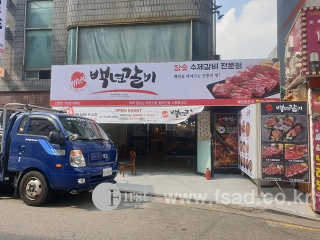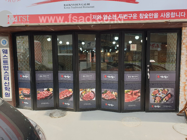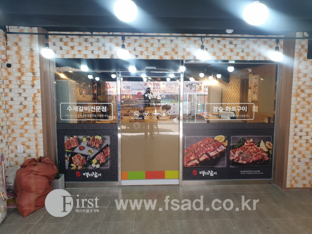 깔끔하게 붙여드렸고 상단 부분에는 백년갈비의 로고와