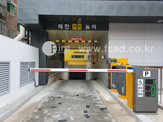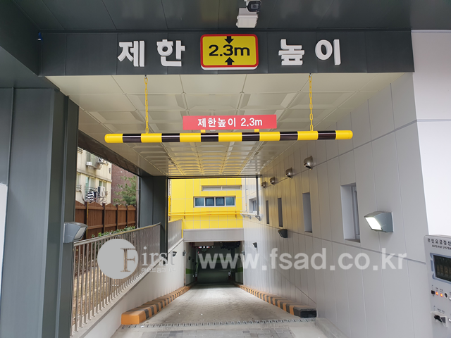 우선 주차장 입구의 높이제한 사인물과 주차장 표시 지주사인, 주차장 내의 안전운행 표찰