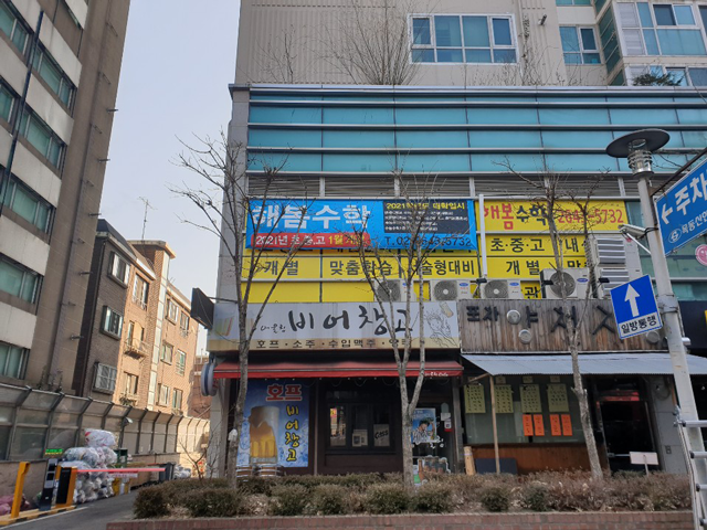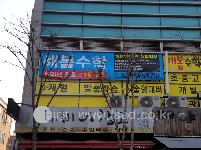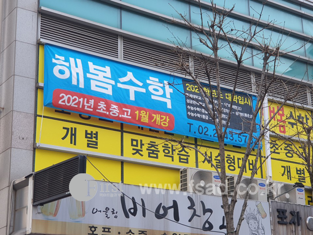 외부에는 실외용 단면 배너 2개 학원 입구에는 실내용 단면 배너 1개를