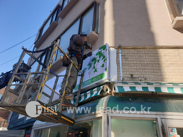 위 사진은 간판 상단에 비가림막을 시공하는 모습으로