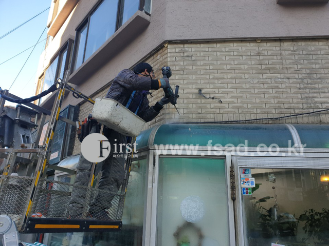 건물 외벽에 구멍을 뚫고 있는 모습으로 구멍을 뚫은 후