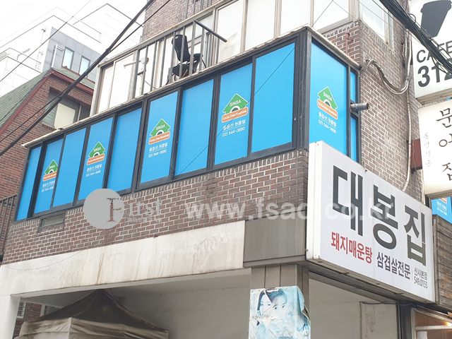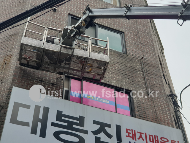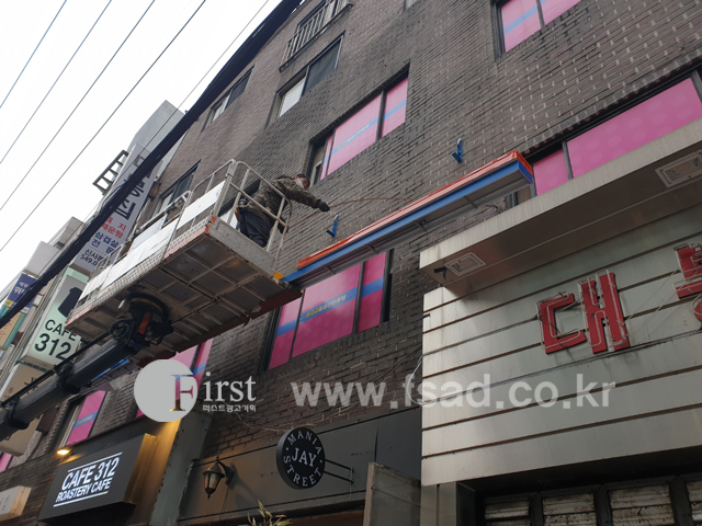 건물 입구 상단도 마찬가지로 건물 3층 높이의 전면#후렉스간판도 마찬가지로