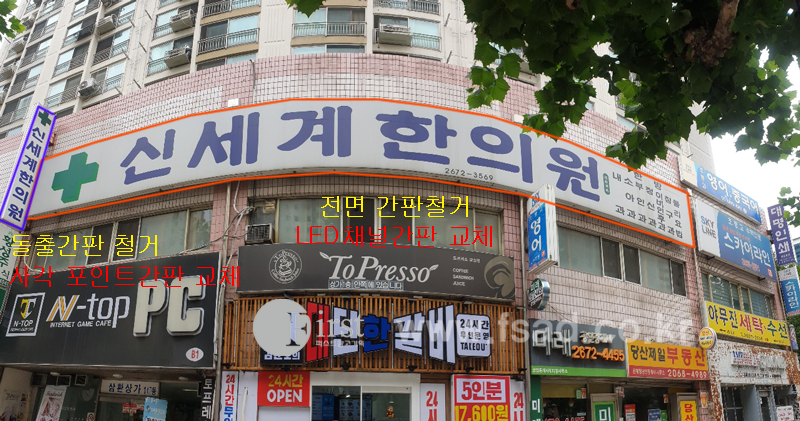 사진에서 보시는 것처럼 전면간판 의 철거 후 LED채널간판 으로 교체