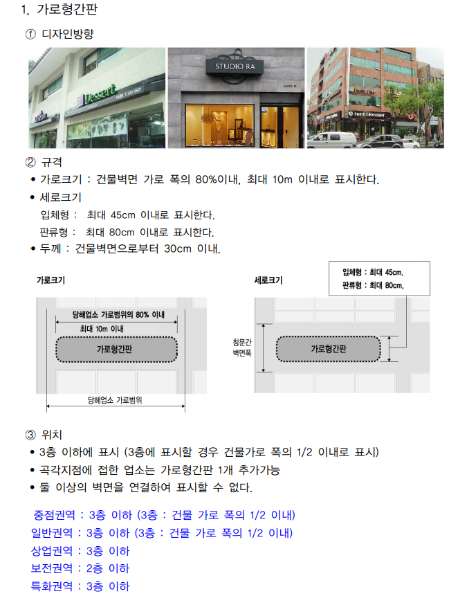 각 행정구역 별로 간판의 크기와 길이 및 위치할 간판의 종류등이