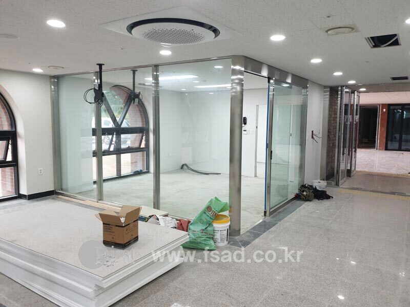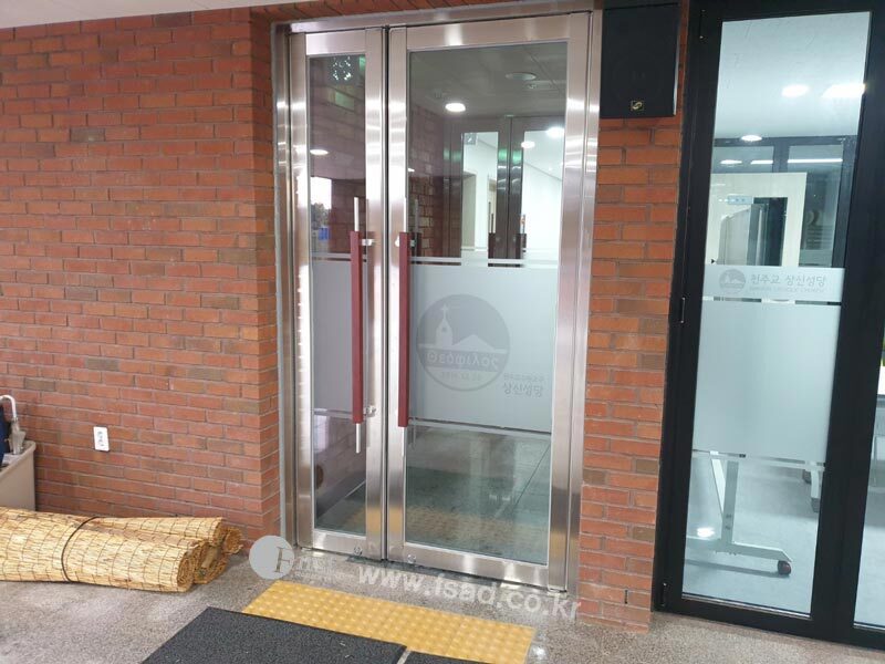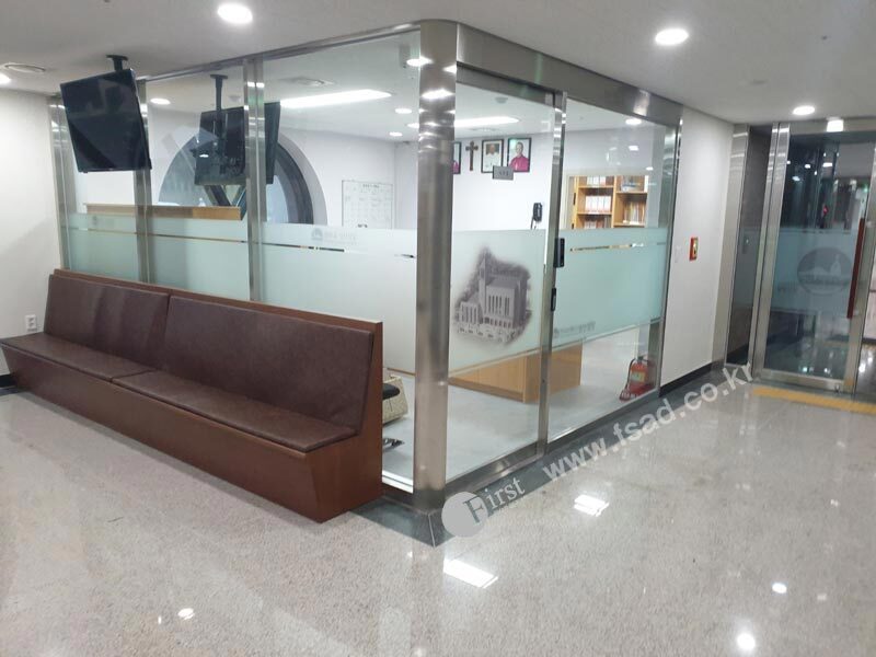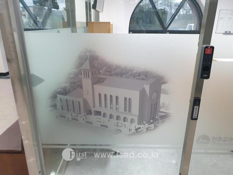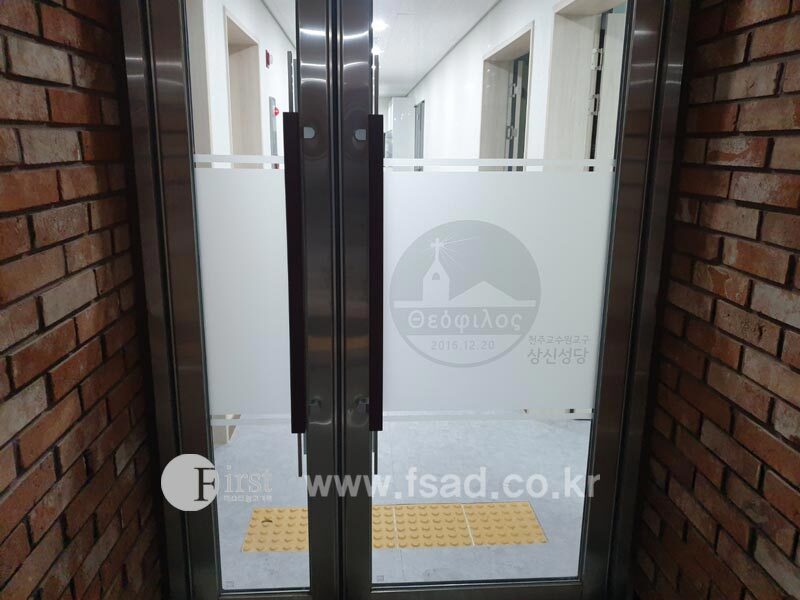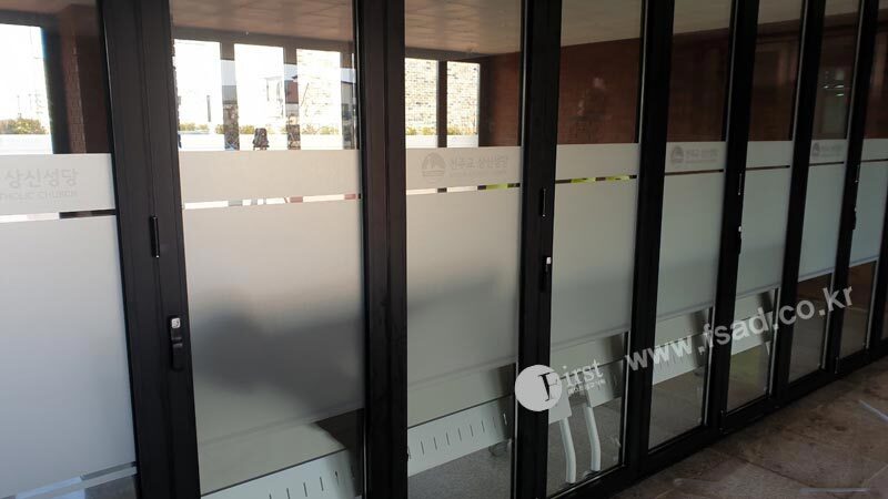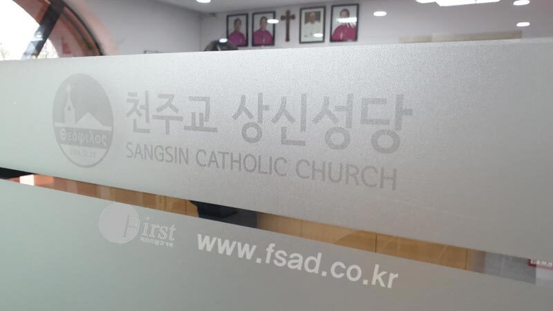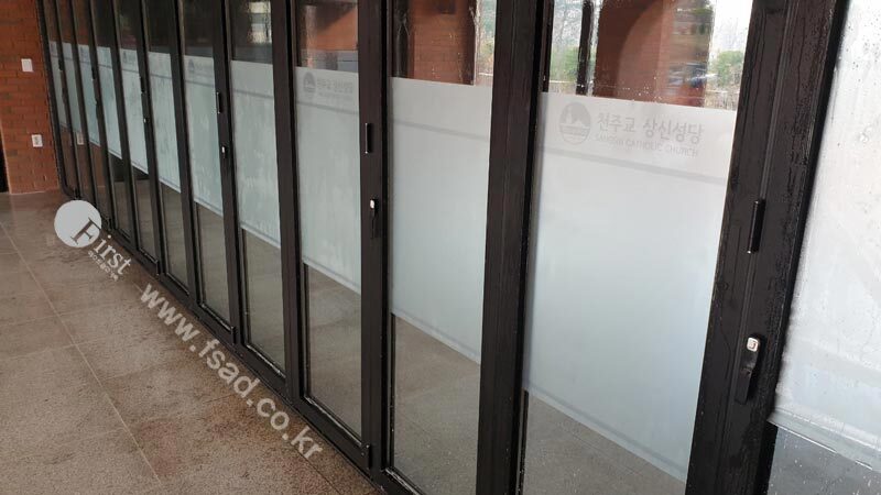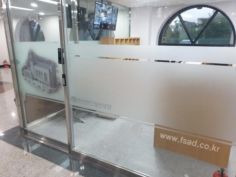 상신성당의 모든 유리창선팅 및 내부사인물 시공이