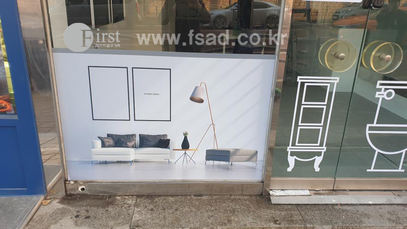 매장 뒷 편의 유리창에도 깔끔하게 실사 를 시공해