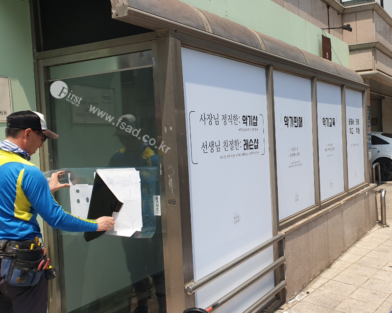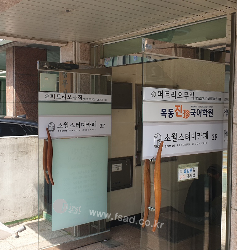 출입문쪽에는 백색시트를 커팅한 문구들을