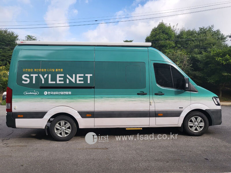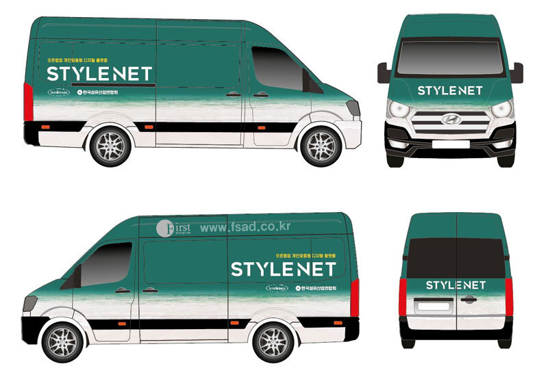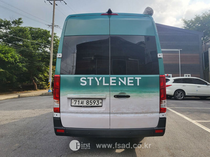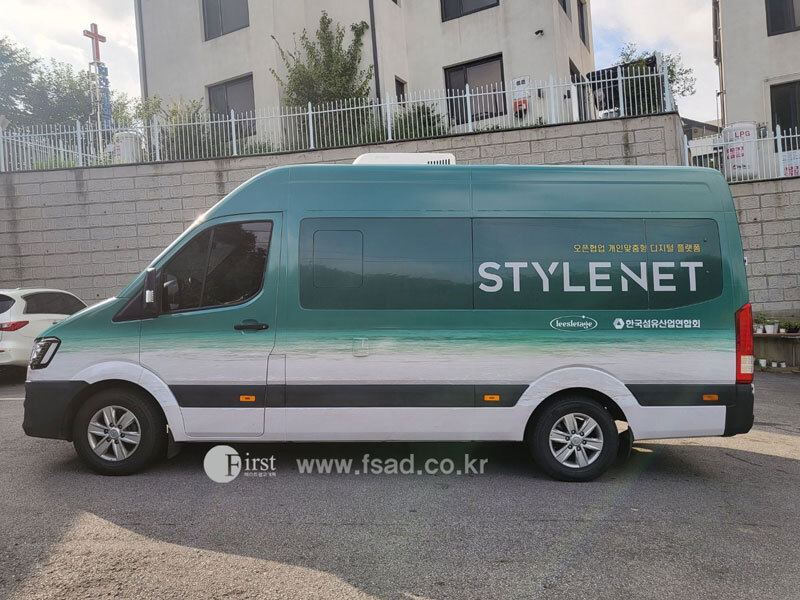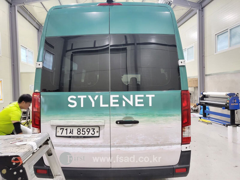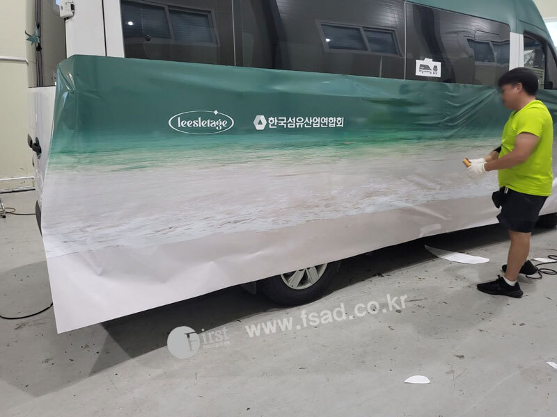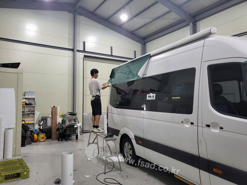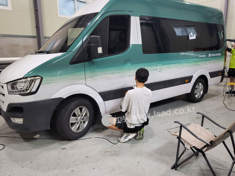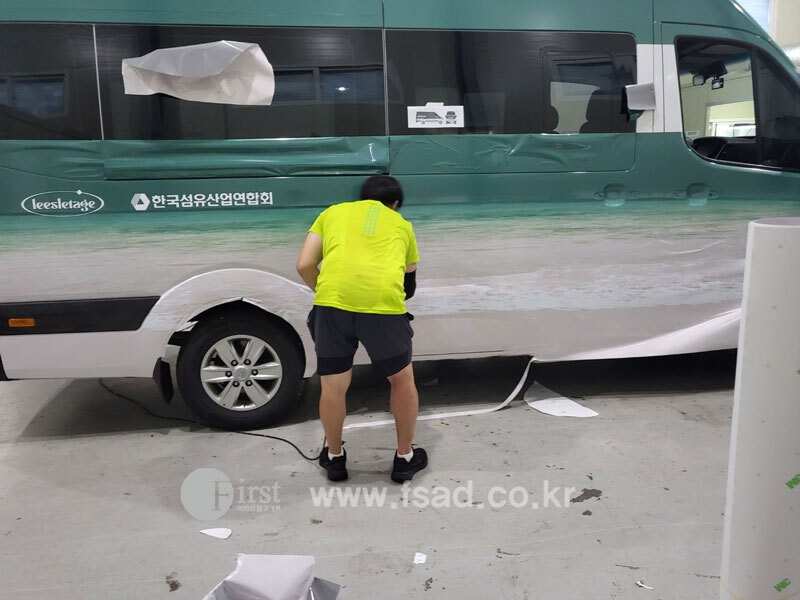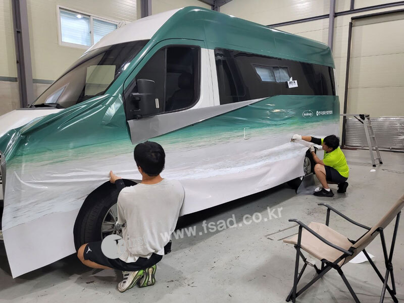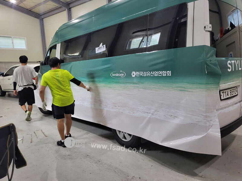 확장된 디자인들을 차량실사를 이용하여 출력후 전체 랩핑중인 모습으로