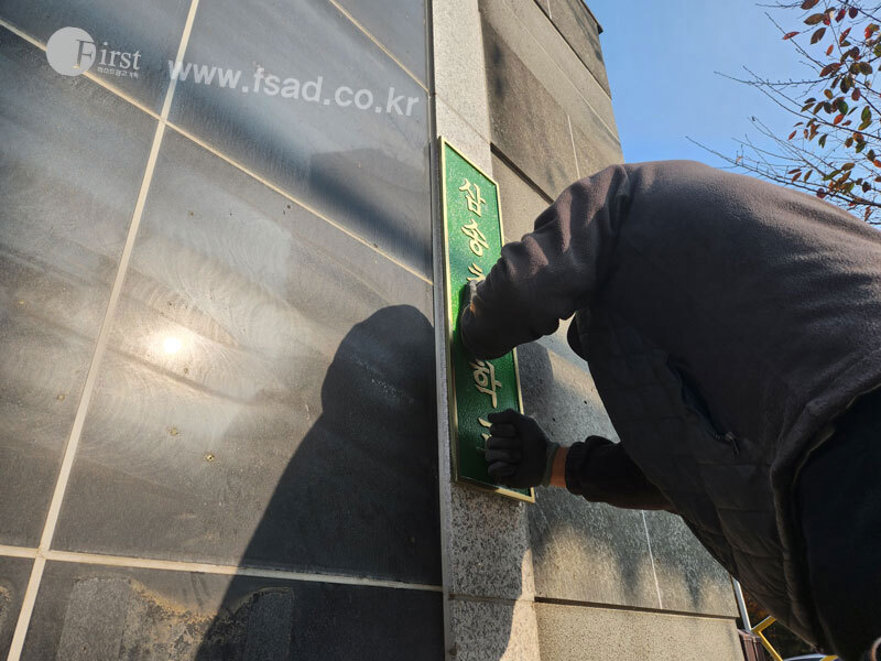 제작이 완료한 신규 주물간판을 시공중인 모습